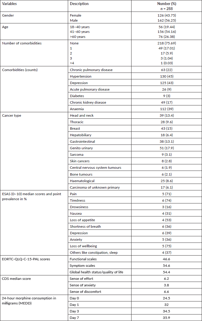 Results: Between May 1, 2019, and April 30, 2020, 5,541 patients were screened for eligibility, and 288 were enrolled (48 patients from each of the six centres). We analysed the data of 288 patients, of which 36.4% had dyspnoea, with 28.5% with moderate to a severe degree (>4/10). Tiredness and loss of appetite were found to have associations with dyspnoea which were statistically significant on multivariate analysis. Standard palliative care management and routine usage of opioids preceded improvement in dyspnoea scores, CDS scores and quality of life scores throughout 7 days.