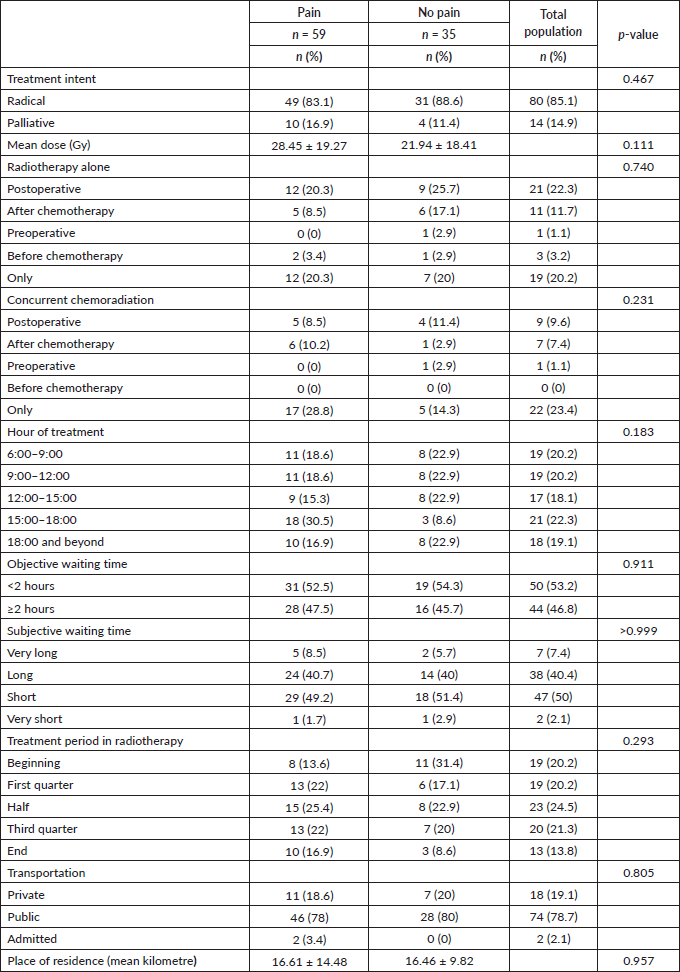 Table 2. Treatment and radiotherapy-related characteristics of patients with and without pain (n = 94).