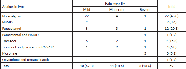 The mean pain intensity score of the patients was 3.6 (SD: 2.3). BPI scores were used to evaluate the severity of pain and the impact of pain on the daily functions of patients. According to the BPI pain score, 40 patients (67.8%) experienced mild pain, 11 patients (18.6%) had moderate pain and 8 patients (13.6%) had severe pain. The BPI pain interference score revealed that 40 patients (67.8%) suffered low pain interference on their daily activities while 19 (32.2%) experienced high pain interference (Table 3). Table 4 and Figure 1 characterise the pattern of analgesic use of 59 patients in the study. Of the 27 patients with pain and no analgesic, 22 had mild pain, 4 had moderate pain and 1 had severe pain. Likewise, most of the patients with mild pain were not taking any form of analgesic. A total of four patients were on strong opioids, three of which were still experiencing severe pain.