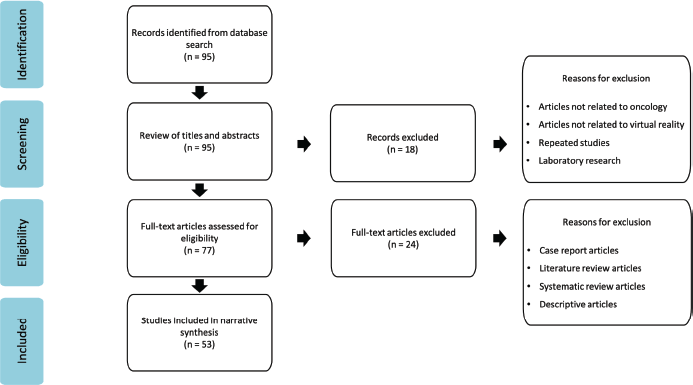 The initial search identified 95 papers. After a review of titles and abstracts, 77 articles were chosen for further review. Of these, 53 full-text articles were selected for data analysis. The study selection process followed the PRISMA guidance and is illustrated in Figure 1.