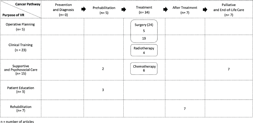Studies related to non-surgical oncology were divided based on the modality of the VR into radiotherapy, rehabilitation and neuropsychiatric intervention. Data were extracted for cancer speciality, purpose of intervention and outcome.