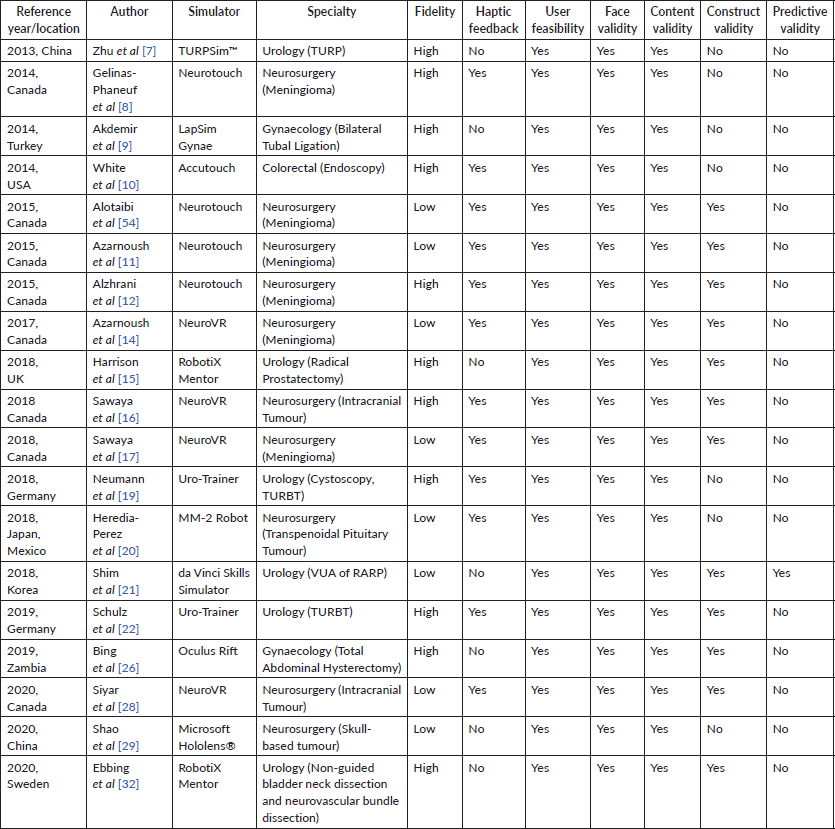 In addition to the characteristics of VR-assisted surgical training tool shown in Table 1, a range of methods used to validate VR-assisted surgical training were consolidated in Table 2. Surgical competency was mostly validated using dexterity parameters (n =17, 89.5%) [8–12, 14–17, 20–22, 26, 28, 32, 54] and objective structured assessment of technical skills (OSATS) (n = 14, 73.7%) [7–12, 15, 16, 19–22, 26, 32, 54]. Psychomotor tasks were used in 11 out of 19 of the studies (57.9%) [7, 8, 10, 11, 14–17, 21, 26, 32]. One study (5.3%) used knowledge-based validation instead [29].