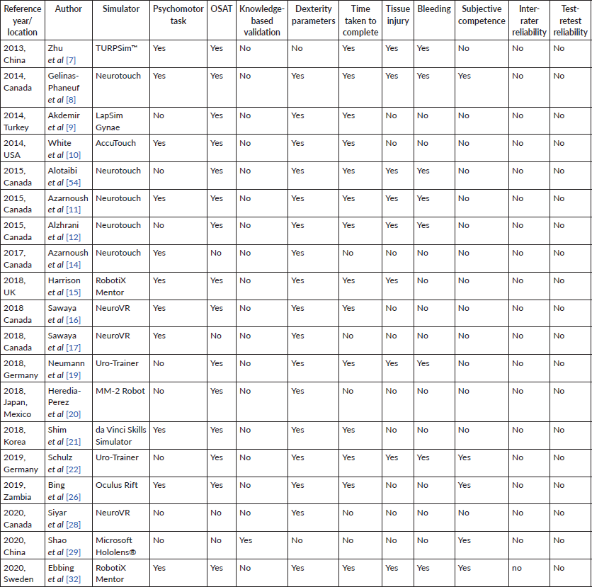 Such evaluation gap is thought to be tightly correlated to a lack of gold standard to validate VR-assisted surgical training tools, also known as method validation gap. This review identified heterogenous methods adopted to validate surgical training, most commonly through psychomotor tasks and OSATS that measure dexterity parameters, time taken to complete task and/or complication rate. Such practice is often enabled by the inbuilt features of the simulators but often lacks in inter-rater and test-retest reliability, which are crucial in distinguishing the level of proficiency of trainee through a peer-review process and in testing their future operative performance.