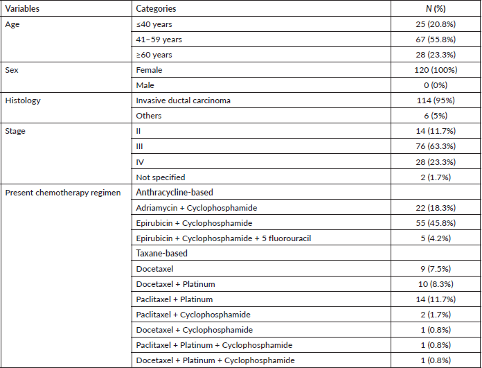 A total of 120 patients who met the selection criteria took part in this study. The sociodemographic, clinical and treatment information of study participants is presented in Table 1. The ages ranged from 22 to 78, with an average of 51.2 years. Sixty-seven (55.8%) patients were in the 41–59-year age category, 25 (20.8%) patients were younger and 28 (23.3%) patients were older. All the patients were female. Most of the cases seen were stage III, 76 (63.3%) followed by stage IV, 28 (23.3%) and stage II 14 (11.7%) (Table 1).