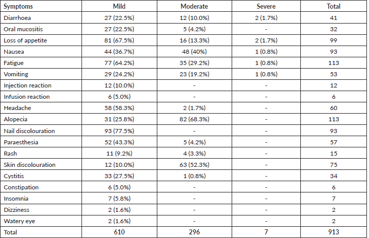 Patients reported between 2 and 13 SEs in the course of their chemotherapy with a median of 8 SEs. A total of 913 SEs was reported by the 120 patients, of which 610 (66.8%) were mild, 292 (32.0%) were moderate and 7 (0.8%) were severe. None of the patients reported life-threatening SEs (Figure 1). The following SEs were most commonly reported: fatigue 113 (94.2%), alopecia 113 (94.2%), loss of appetite 99 (82.5%), nausea 93 (77.5%), nail discolouration 93 (77.5%), skin hyperpigmentation 75 (62.5%) and headache 60 (54.5%), (Table 2). Very few patients had severe SE such as diarrhoea 2 (1.6%), loss of appetite 2 (1.6%), nausea 1 (0.8%), malaise 1 (0.8%) and vomiting 1 (0.8%) (Table 2).