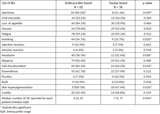 Each of the patients reported SEs ranging between 2 and 13, most of which were mild. This may be because the majority of the patients were on multiple agents. As a rule of combination therapy, the selected drug should have non-overlapping toxicity [29]. This allows toxicity to be distributed across multiple organ systems and avoids significant toxicity in individual organs [29]. Patients on ABC reported more SEs when compared with taxane-based (8 versus 7, p = 0.044). This is in agreement with the findings of Nyrop et al [16] (7 versus 5, p = 0.01).