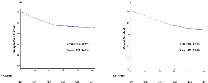 By the time of this analysis, 83 patients (21.5%) patients had died (52 to disease progression and 31 to other causes), 295 patients (76.6%) patients were documented alive (289 without disease and 6 with disease), while 7 patients (1.9%) were lost to follow-up. A total of 58 (15%) recurrences were seen in the entire cohort, out of which majority of them 34 (58.6%), had distance recurrences, while 13 (22.4%) had locoregional recurrences. Eleven patients had both local as well as distant recurrences. Out of these 58 patients with recurrences, only 4 (6.9%) were treated with radical intent and the remaining 54 (93.1%) were treated with palliative intent only. All four patients who were treated radically had presented with isolated local recurrence. All of them were hormone positive and had developed recurrence after a median disease-free interval of 18 months (range: 10–24 months). The most common salvage treatment was a combination of chemotherapy and RT for 11 (19%) patients followed by chemotherapy or RT alone for 6 (10.3%) patients. Twenty-five (43.1%) patients were not fit for any further treatment and were referred to palliative services for the best supportive care, while 12 (20.7%) patients defaulted for any further treatment.