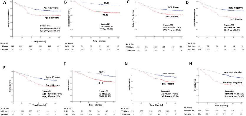 Figure 2. Kaplan–Meier curves of RFS (upper panel) and OS (lower panel) stratified by age (<80 versus >80 years) (a and e); T size (T0-T2 versus T2-T4) (b and f); presence of LVSI (LVSI present versus LVSI absent) (c and g); HER2 receptor status (positive versus negative) (d) and hormonal receptor status (positive versus negative) (h).