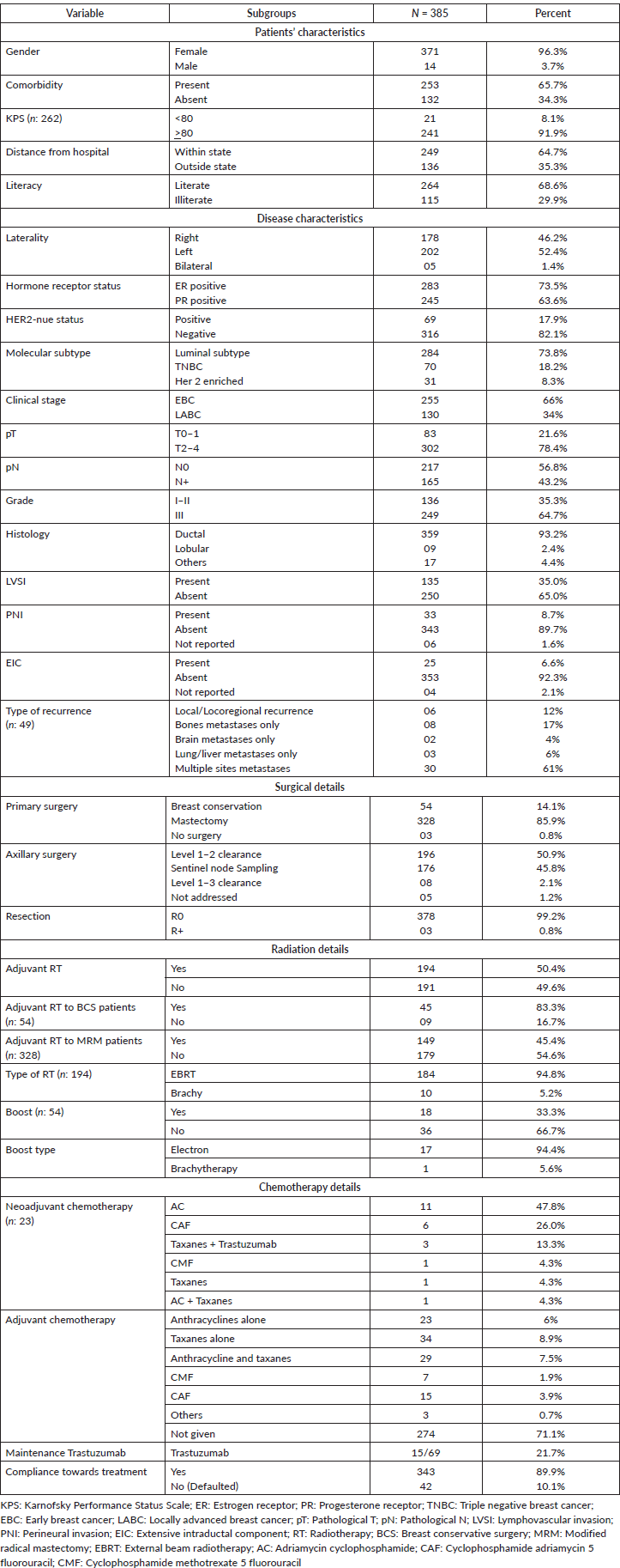 Three hundred and twenty-eight (85.9%) patients underwent mastectomy while only 54 (14.1%) underwent breast conservation surgery (BCS). Three patients did not undergo surgery despite advising the same. Twenty-three patients received neoadjuvant chemotherapy while, 111 patients received adjuvant chemotherapy. Out of these patients, 13 patients had grade 3 or higher toxicity in the form of febrile neutropenia in 7, peripheral neuropathy in 4 and cardiac toxicity in 2 patients. Only 15 (21.7%) patients of the 69 HER2-neu receptor-positive patients received adjuvant Trastuzumab. No other anti-HER2 therapy was advised. Adjuvant hormone therapy was planned using letrozole in 158 (55.6%) patients, while tamoxifen was prescribed in 126 (44.4%). Adjuvant radiation was planned for 194 (50.3%) women based on the type of surgery and disease stage. Of the 54 patients who underwent BCS, 13 patients did not receive adjuvant RT due to competing risk from multiple co-morbidities or observation was offered due to favourable disease profile. Post-mastectomy RT (PMRT) was advised for node-positive disease or locally advanced tumours at the time of presentation as per institutional protocol. The median dose fractionation of RT to breast or chest wall was 40 Gy in 15 fractions over a period of 3 weeks, while the median dose for the boost in the case of BCS was 12.5 Gy in 5 fractions. RT was tolerated well by most of the patients who had grade I acute skin reactions (86.9%) and grade I acute dysphagia (93.1%). Compliance towards the treatment is defined as the proportion of patients those who had finished the planned treatment completely. The overall compliance towards planned treatment was shown by 343 (89.9%) of patients. The compliance of patients towards surgery, radiation therapy and chemotherapy was 99.2%, 90.14% and 81.20%, respectively. The major reasons for non-compliance for the whole treatment completion included comorbidities (45.2% of patients had comorbidities; p: 0.003) and illiteracy (57.1% were illiterate; p < 0.001). The difference between compliance towards systemic treatment in patients with or without comorbidities was not significant (26% versus 34%; p: 0.06). Relevant treatment-related details of the study cohort are described in Table 1.