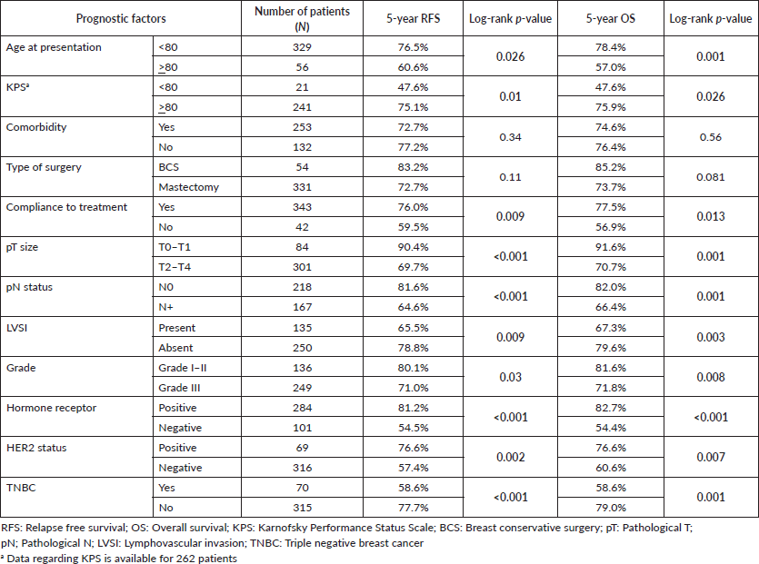 Results: A total of 385 elderly (>70 years) breast cancer patients (range 70–95 years) were treated at our hospital from January 2013 to December 2016. The hormone receptor was positive in 284 (73.8%) patients; 69 (17.9%) patients had over-expression of HER2-neu, while 70 (18.2%) patients had triple-negative breast cancer. A large majority of women (N = 328, 85.9%) underwent mastectomy while only 54 (14.1%) had breast conservation surgery. Out of 134 patients who received chemotherapy, 111 patients received adjuvant, while the remaining 23 patients received neoadjuvant chemotherapy. Only 15 (21.7%) patients of the 69 HER2-neu receptor-positive patients received adjuvant trastuzumab. Adjuvant radiation was given to 194 (50.3%) women based on the type of surgery and disease stage. Adjuvant hormone therapy was planned using letrozole in 158 (55.6%) patients, while tamoxifen was prescribed in 126 (44.4%). At the median follow up of 71.7 months, the 5-year overall survival, relapse-free survival, locoregional relapse-free survival, distant disease-free survival, breast cancer-specific survival were 75.3%, 74.2%, 84.8%, 76.1% and 84.5%. Age, tumour size, presence of lymphovascular invasion (LVSI) and molecular subtype emerged as independent predictors of survival on multi-variate analysis.