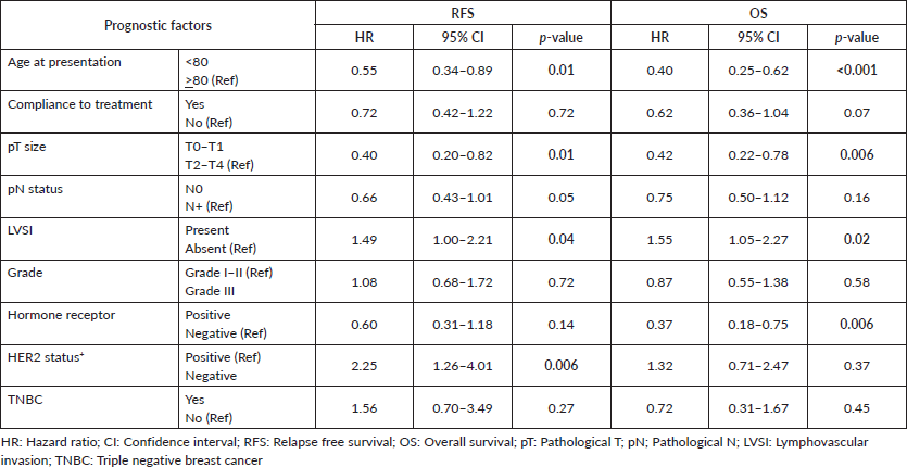 Table 3. Multi-variate analysis of prognostic factors in elderly breast cancer patients. Clinically significant values are shown in bold.