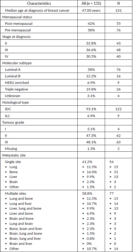 The baseline patient characteristics are summarised in Table 1. The median age at diagnosis of breast cancer was 47.00 years (IQR 18). Overall, 30.5% (40) of patients were diagnosed with de novo MBC while 69.5% (91) had progression of disease from an earlier stage.