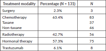 Out of the 131 patients included in the study, 87.0% (114) received treatment for metastatic disease. Out of these, 63.3% (83) patients had chemotherapy, 57.3% (75) had hormonal therapy and 47.7% (56) had radiotherapy. In those who received treatment for metastatic disease, 53.4% (70) had both chemotherapy and hormonal therapy. Only three of the patients had surgery for metastatic disease; two patients had a ‘toilette’ mastectomy done and one patient had intramedullary nailing for an impending fracture femur (Table 2).