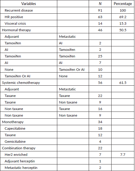 Out of the 91 patients with recurrent disease, 61.5% (56) received systemic chemotherapy for metastatic disease. Among these patients, 15.3% (14) presented with a visceral crisis. Only 46.2% (42) had received prior chemotherapy. In the group receiving chemotherapy for recurrence, 67.9% (38) received taxane-based therapy for metastatic disease while 32.1% (18) received non taxane-based therapy. Capcetabine was the most common single agent used (n = 16), (Table 3).