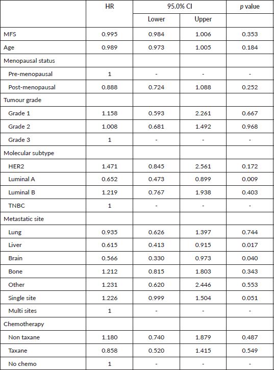 Using the Cox regression model, several potential prognostic factors were evaluated (Table 4). Disease factors which showed a significant positive effect on survival time were Luminal A molecular subtype (HR 0.652 CI 0.473–0.899). Metastasis to the liver or brain was significant negative prognostic factors (HR 0.615 CI 0.413–0.915 and HR 0.566 CI 0.330–0.973, respectively). MFS, age at diagnosis, menopausal status, tumour grade and type of chemotherapy given did not show any statistically significant effect on survival after the diagnosis of MBC on univariate analysis.