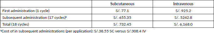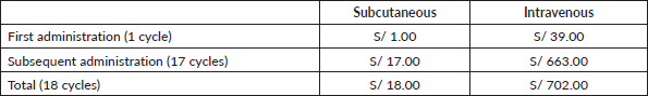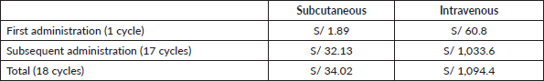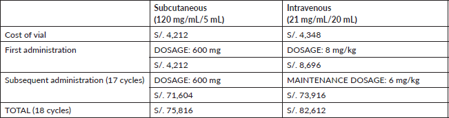 The cost of a Specialised Medical Oncology Treatment Application on an outpatient by SC-TZM is S/. 1.00 and by IV-TZM is S/. 39.00. In general, the cost related to the use of an armchair for SC presentation represents a saving of approximately 97% (S/.18 versus S/.702) in 18 treatment cycles compared to IV administration (Table 6).