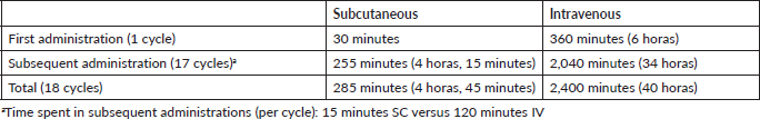 Administration time is defined as the time from the patient sitting in the infusion chair to the moment in which they get out of the chair at the end of each treatment cycle. Administration cost was calculated using the salary per minute of a licensed nurse specialist in Oncology.