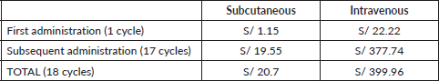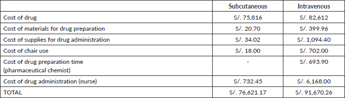 Table 5. Total cost of supplies for drug administration (expressed in local currency: Soles).