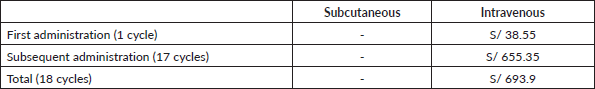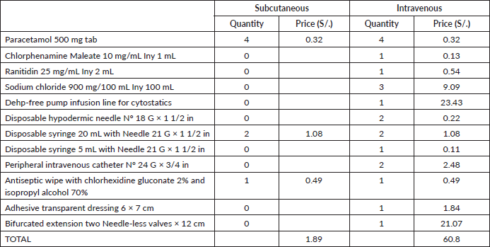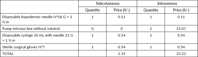 Table 4. Cost of supplies for drug administration for a single-dose (expressed in local currency: Soles).