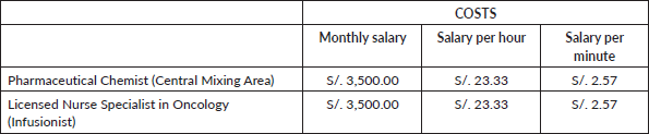 The cost of Pharmacy Staff time, from the Central Mixing Area, and Nurse Time associated with treatment preparation was estimated by dividing the average monthly salary by the 150 hours scheduled in 1 month to calculate the hourly cost, giving a salary of S/. 23.33 and S/. 2.57 per hour and minute, respectively (Table 7).