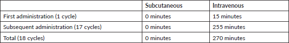 The drug administration time is defined as the time from the patient sitting in the infusion chair to the moment in which they get out of the chair at the end of each treatment cycle. For IV presentation, the starting dosage should be administered as an IV infusion over 90 minutes. Patients are observed for 6 hours since the start of the first infusion and for 2 hours since the start of subsequent infusions for symptoms such as fever and chills or other infusion-related symptoms. If the starting dosage is well tolerated, subsequent doses may be administered as a 30-minute infusion [18]. For SC presentation, the recommended dosage is 600 mg administered by SC injection (under the skin) over 2–5 minutes. Monitoring is needed in case of adverse effects during administration and for at least 30 minutes after the first administration and for 15 minutes after subsequent administrations [18].