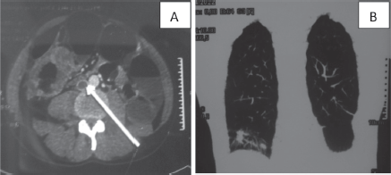 Figure 1. CT scan of a 37-year-old man: (a): Cross-section of inferior vena cava thrombosis (white arrow) and a circumferential mass of the right colon. (b): Frontal section of lung metastases.