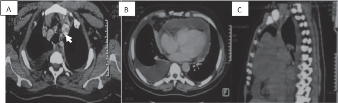Figure 2. CT scan of a 58-year-old man (a): Cross-section of brachiocephalic trunk thrombosis (white arrow). (b): Cross-section of right pericardial and pleural effusion. (c): Sagittal section with a mediastinal mass.
