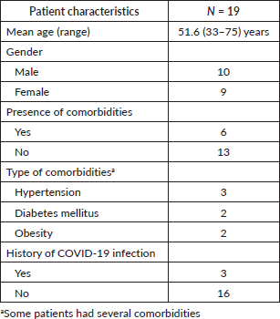 The average age was 51.2 years. The sex ratio was 1.1 in favour of males. Of our patients, six had a comorbidity. Hypertension was the most frequent (n = 3) comorbidity. Three patients were found to have had a previous COVID-19 infection, (Table 1).