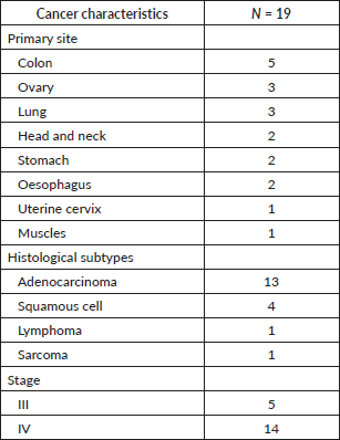 The largest number of incidental VTE were seen in patients with colon cancer (n = 5), followed by ovarian cancer (n = 3) and lung cancer (n = 3). Adenocarcinoma was the most frequent histological type (n = 13), followed by squamous cell carcinoma (n = 4). All 19 patients had advanced cancer: 5 had stage III cancer and the other 14 had stage IV cancer (Table 2).