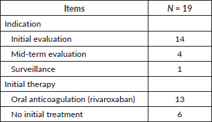 Fourteen patients underwent imaging for an initial evaluation of their cancer, four were at the mid-term evaluation. Following the diagnosis of VTE, 13 individuals (68.4%) were initially treated with an oral anticoagulant (rivaroxaban). The remaining six patients did not receive any anticoagulant treatment (Table 3).