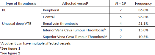 During our study period, we recruited 19 patients with incidental venous thrombosis among the 359 who underwent routine staging or treatment assessment CT scans. This represents a frequency of 5.3%.