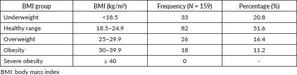 Table 1 summarises the distribution of BMI categories among the participants. In all, 82 patients (51.6%), were within the healthy BMI range of 18.5 to 24.9 kg/m² whereas 18 (11.2%) were in the obesity category. Also, 33 patients (20.8%) were underweight whereas 26 (16.4%) were overweight.