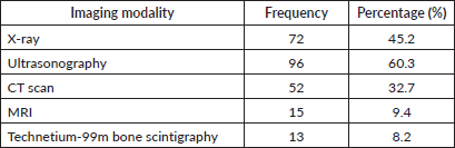 In the detection of metastatic cancer sites among the participants, ultrasonography was the most frequently used imaging modality (60.3%), followed by X-rays (45.2%) and CT scans (32.7%) as summarised in Table 2. MRI and bone scintigraphy were less commonly used, 9.4% and 8.2%, respectively.