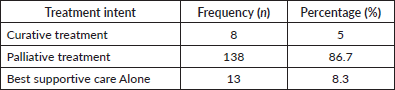 Table 3 illustrates the distribution of treatment intention among the patients. In all, 138 (86.7%) received palliative treatment whereas 8 patients (5%), were treated with curative intent. Additionally, 13 patients (8.3%) received best supportive care alone.