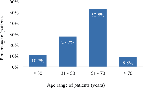 The mean age was 50.9 years (SD 15.2) ranging from 15 to 90 years. A considerable proportion (52.8%) were between 51 and 70 years old. In all, 10.7% were ≤30 years old whereas 8.8% were older than 70 years as illustrated in Figure 2.