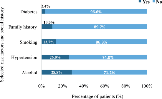 In all, 28.8% had a history of alcohol intake whereas 13.7% had a history of tobacco smoking. Also, 26% were simultaneously diagnosed with hypertensive heart disease whereas 3.4% had diabetes mellitus. In all, 10.3% of the patients had a positive family history of cancer (Figure 3).