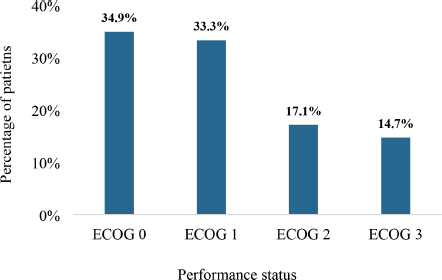 Figure 5 illustrates the Eastern Cooperative Oncology Group (ECOG) performance status of the study participants. In all, 34.9% had a performance status of ECOG 0 whereas 33.3% were ECOG 1. Also, 17.1% and 14.7% had performance statuses of ECOG 2 and 3, respectively. There were no patients who had a performance status of either ECOG 4 or 5.