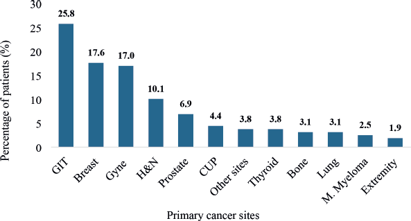 Figure 6. The primary cancer sites of patients with de novo metastasis. GIT: gastrointestinal tract, Gyne: gynecological system, H&N: head and neck, CUP: cancer of unknown primary, M. myeloma: multiple myeloma. Cancers diagnosed in the GIT were colorectal, anal, gastric, pancreatic and esophageal cancers as well as hepatobiliary cancers. Breast cancers are essentially invasive ductal carcinomas. The primary tumours of the gynecological system comprised cervical, ovarian, endometrial and vulva cancers. Primary cancers diagnosed in the H&N region included nasopharyngeal, hypopharyngeal, laryngeal oropharyngeal, maxillary sinus, parotid and other salivary gland tumours. Cancers of the extremities comprised sarcomas of either upper or lower limbs. Other primary cancer sites not otherwise represented in figure 8 were tumours of the skin, kidney, hematological and soft tissue sarcomas of the back.