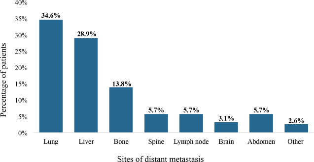 The lungs were the most frequent sites of distant metastasis among the patients (34.6%), followed by the liver (28.9%) and bone (13.8%). Also, spine, non-regional lymph node and brain metastases were detected among 5.7%, 5.7% and 3.1% of the patients, respectively, as illustrated in Figure 7.