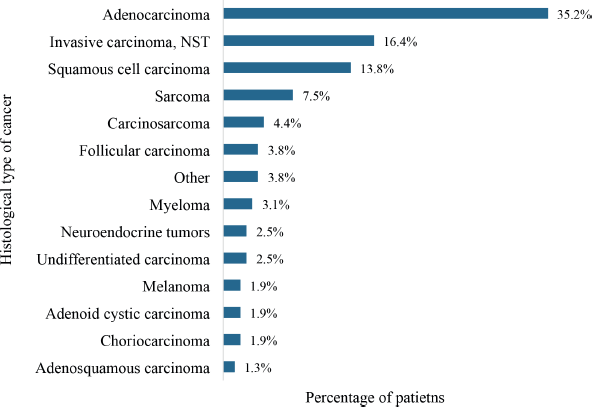 The commonest histological type was adenocarcinoma (35.2%) followed by invasive carcinoma of no special type (16.4%), squamous cell carcinoma (13.8%) and sarcoma (7.5%) as shown in Figure 8. Also, 7.5% were soft tissue sarcomas of various body sites whereas 3.8% were follicular carcinomas of the thyroid gland. Carcinosarcomas of the uterine corpus accounted for 4.4% of the cases.