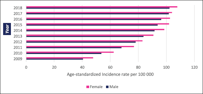 Figure 5. Gastric cancer ASR, per 100,000 females and males from 2009 to 2018.