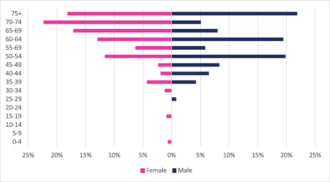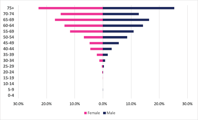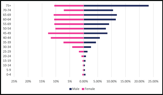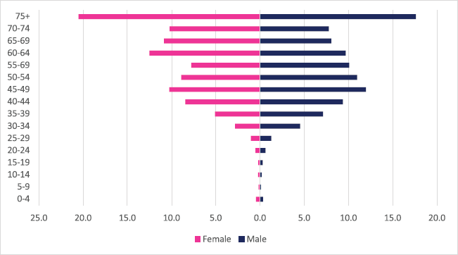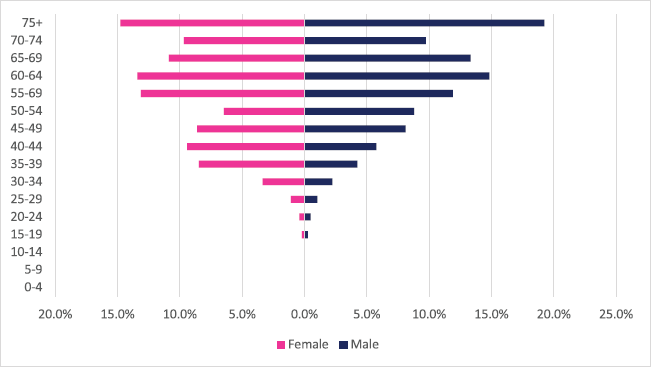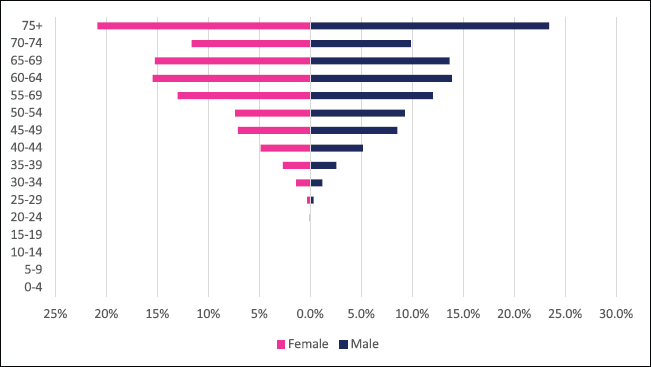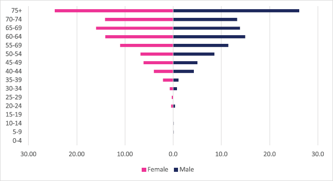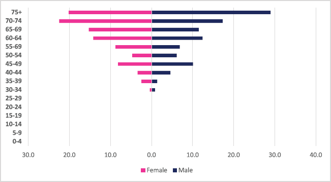 Figure 11. Gall bladder cancer ASR, females and males age-sub-populations 2009–2018.