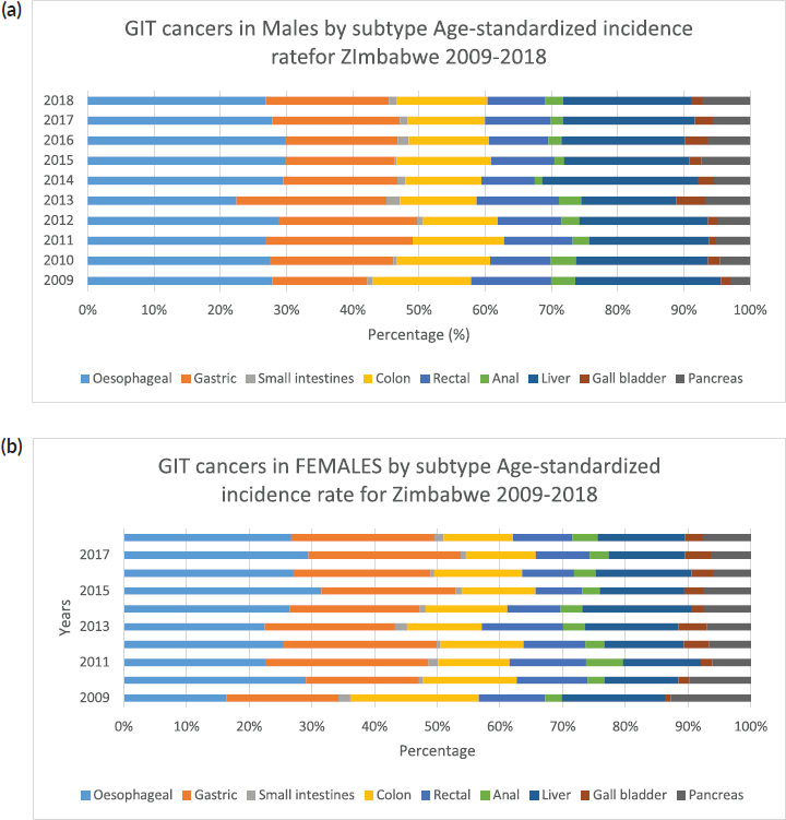 Supplementary Figure 1. (a): GIT cancers in males by subtype ASR for Zimbabwe 2009–2018. (b): GIT cancers in Females by subtype ASR for Zimbabwe 2009–2018.