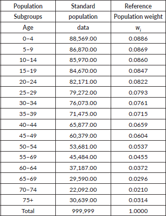 • Age-adjusted rates are derived by applying the category-specific incidence and mortality rate (only for 2017 and 2018) of each population GIT subtype to a single standard population (Table 1). This produces ASR that the country would have if it had the same age distribution as the standard population.