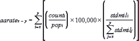 • The age-adjusted rate for an age group comprised of the ages x through y is calculated using the following formula [1].
