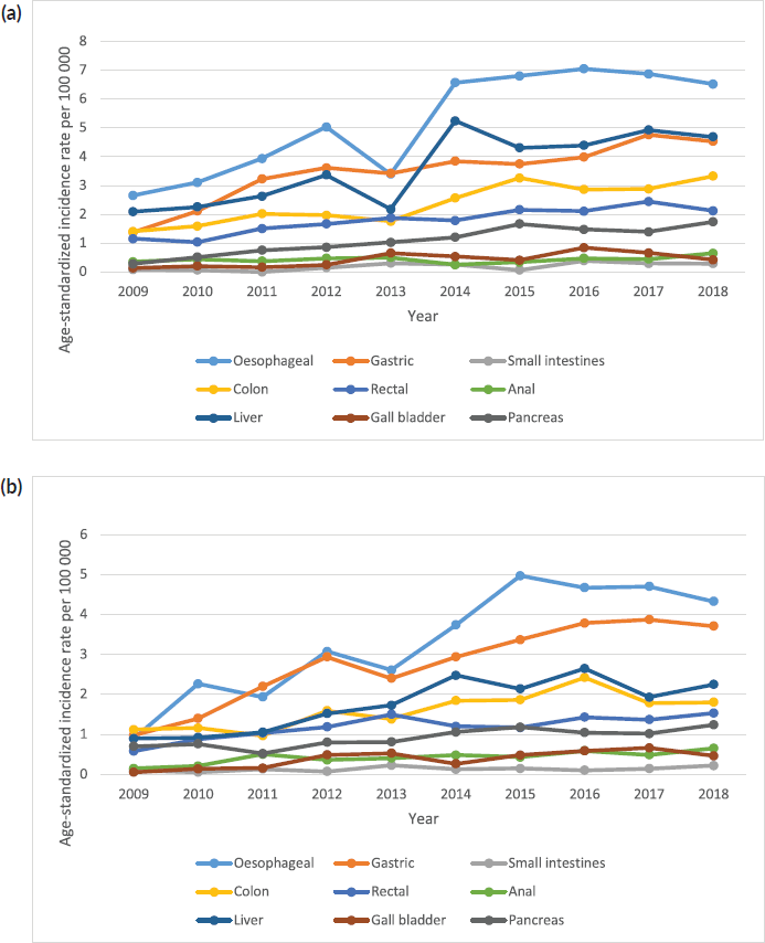 Methods: Demographic data and incidence of GI cancer subtypes were collected and analysed from the ZNCR annual reports from 2009 to 2018. Age standardised rates (ASRs) for each GI cancer subtype were calculated and simple trend analysis was performed over the 10-year study period.