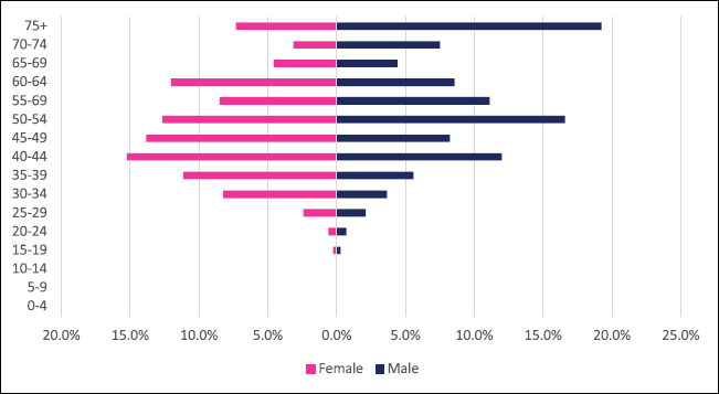 In Zimbabwe, 63,195 new cases of cancer were diagnosed between 2009 and 2018 with 26,677 male and 36,518 female cases giving a male-to-female ratio of 1:1.4. From 2009 to 2018 the annual total of new cancer cases more than doubled from 3,519 to 7,841. The annual age-standardised incidence rate (ASR) over the 10-year period increased consistently throughout the period as shown in Figure 1. In males, the annual ASR for all new cancer cases increased from 40.5 per 100,000 in 2009 to 102 per 100,000 in 2018. In females, the annual ASR for all new cancer cases increased from 47.8 per 100,000 in 2009 to 109.8 per 100,000 in 2018. The ASR increased over the 10-year period by 152.3% in males and 125.6% in females. The average annual increase in ASR for all cancer types was higher in males than females (11.3% versus 9.87%). Analysing ASR by age sub-grouping showed that 27.3% and 17.1% of all new cancer cases were diagnosed before the age of 45 years in females and males, respectively (Figure 2). Between 2009 and 2018; 21,238 cancer-related deaths were reported in Zimbabwe with females accounting for 53% of cases and a male-to-female ratio of 1:1.1. Overall crude mortality rate increased from 8.4 per 100,000 to 18.4 per 100,000. Male overall crude mortality increased by 117% from 8 per 100,000 to 17.4 per 100,000 from 2009 to 2018 while female crude mortality rate increased by 119% from 8.8 per 100,000 to 19.3 per 100,000.