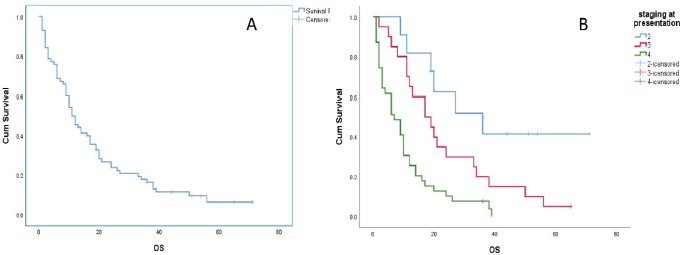 The disease is associated with poor survival outcomes, particularly in advanced stages. In our study, most patients presented with stage III-IV disease, with a median OS of 11.0 months. This is consistent with findings from Iran, where the median OS was reported as 16.33 months [68], and Turkey, where it was 18 months [69]. Data from the SEER database further illustrate the stage-dependent survival disparities, with median survival rates of 96 months for stage I, 30 months for stage II, 20 months for stage III and 14 months for stage IV [70]. In the multivariate analysis, only stage (III/IV) remained statistically significant, indicating it was a critical independent predictor. This underscores the importance of early detection, as advanced stages are strongly associated with worse outcomes [7175].