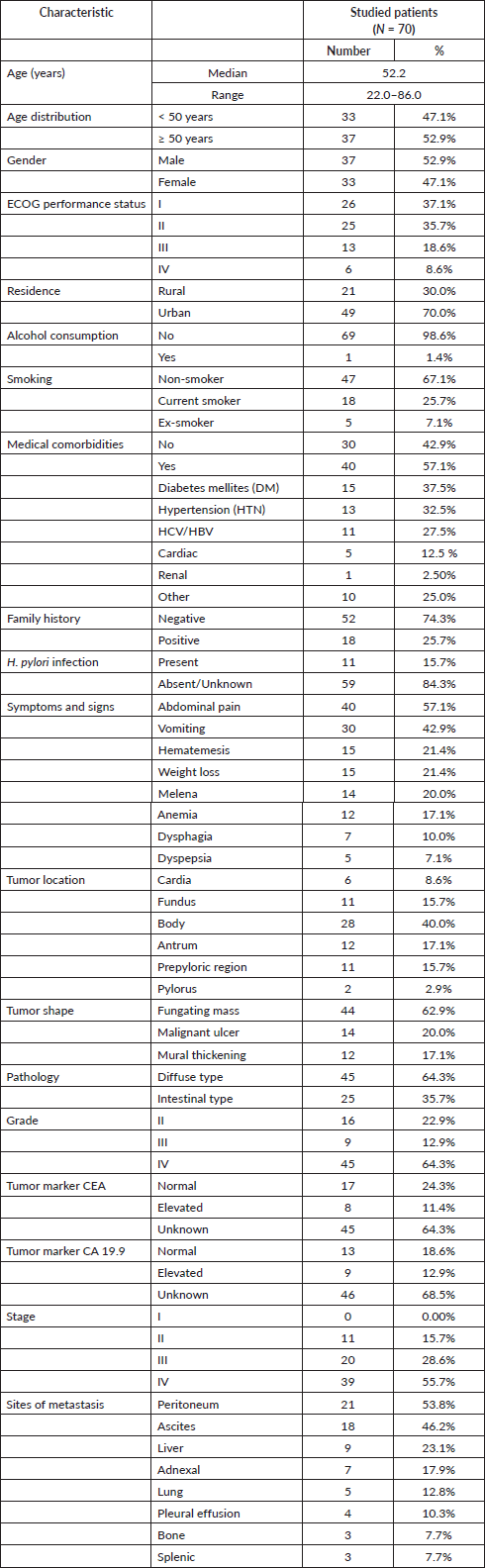 The characteristics of the 70 studied patients with GACare summarised in Table 1. The median age was 52.2 years, ranging from 22.0 to 86.0 years. Age distribution revealed that 47.1% of patients were younger than 50, while 52.9% were aged 50 years or older. Gender distribution was nearly equal, with 52.9% male and 47.1% female patients. Performance status assessment revealed a varied distribution, with 37.1% categorised as Grade I, 35.7% as Grade II, 18.6% as Grade III and 8.6% as Grade IV. Most patients resided in urban areas (70.0%). Alcohol consumption was reported in only 1.4% of patients, while the majority (98.6%) reported no alcohol intake. Similarly, 67.1% were non-smokers, 25.7% were current smokers and 7.1% were ex-smokers. Over half of the patients (57.1%) had medical comorbidities, with diabetes mellitus (37.5%) and hypertension (32.5%) being the most prevalent. Family history of gastric cancer was positive in 25.7% of cases. Helicobacter pylori infection was found in 15.7% of GAC patients, while 84.3% were free of the infection. Symptoms and signs commonly observed included abdominal pain (57.1%), vomiting (42.9%) and weight loss (21.4%). Most tumours were in the gastric body (40.0%), followed by the antrum (17.1%) and fundus (15.7%). Most tumours exhibited a fungating mass (62.9%) on imaging. Pathological analysis revealed that most tumours were of the diffuse type (64.3%). Grading indicated that most tumours were Grade IV (64.3%). Tumour markers CEA and CA 19.9 were elevated in 11.4% and 12.9% of patients, respectively, while the majority had unknown marker levels (CEA: 64.3%, CA 19.9: 68.5%). Most patients were diagnosed at advanced stages, with 55.7% at Stage IV. The most common sites of metastasis are the peritoneum (53.8%), ascites (46.2%) and liver (23.1%).