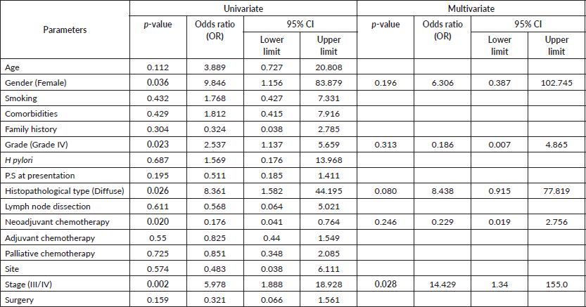 In Table 3, the analysis of various parameters revealed significant associations with mortality in GAC patients. In the univariate analysis, female gender (p = 0.036; OR = 9.846; 95% CI: 1.156–83.879), higher grade (Grade IV) tumours (p = 0.023; OR = 2.537; 95% CI: 1.137–5.659) and the diffuse histopathological type (p = 0.026; OR = 8.361; 95% CI: 1.582–44.195) were significantly associated with increased mortality risk. Additionally, the absence of neoadjuvant chemotherapy (p = 0.020; OR = 0.176; 95% CI: 0.041–0.764) and advanced stage (Stage III-IV) (p = 0.002; OR = 5.978; 95% CI: 1.888–18.928) were also significantly associated with higher mortality rates. Furthermore, upon conducting multivariate analysis and adjusting for these factors, advanced stage (Stage III/IV) disease remained a significant independent predictor of mortality (p = 0.028; OR = 14.429; 95% CI: 1.34–155.0), reinforcing its importance as a prognostic indicator in GACs.